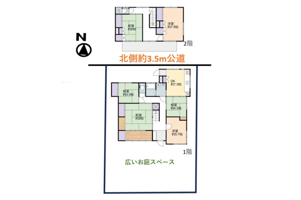 接道状況 | 北側約3.5m公道 | 延床面積 | 1F:72.25㎡ 2F:41.31㎡ 合計:113.56㎡(登記簿) |
