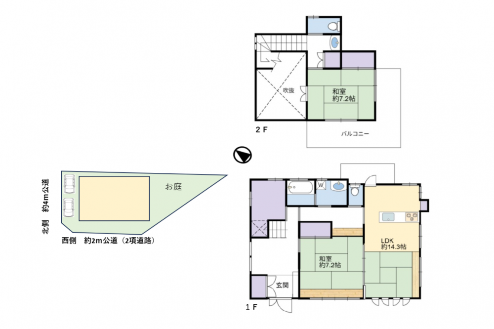 | 接道状況 | 北側約4m・西側約2m公道 | 延床面積 | 1F:77.95㎡ 2F:25㎡ 合計:102.95㎡(登記簿) |